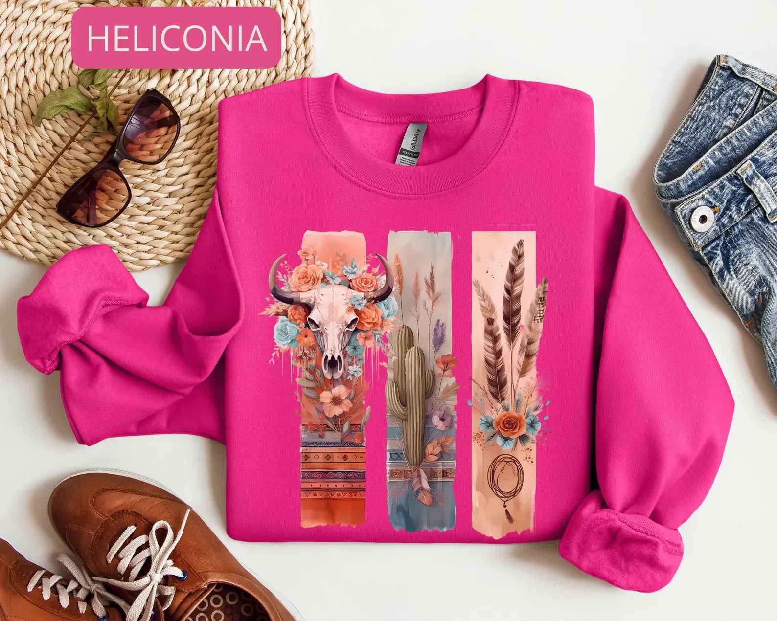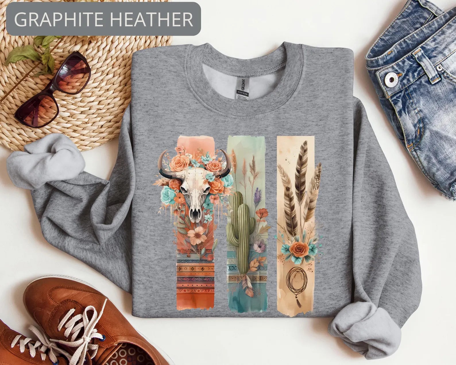 Channel soft western vibes with this beautifully detailed boho cow skull sweatshirt featuring desert florals, cactus art, feathers and earthy tones.
