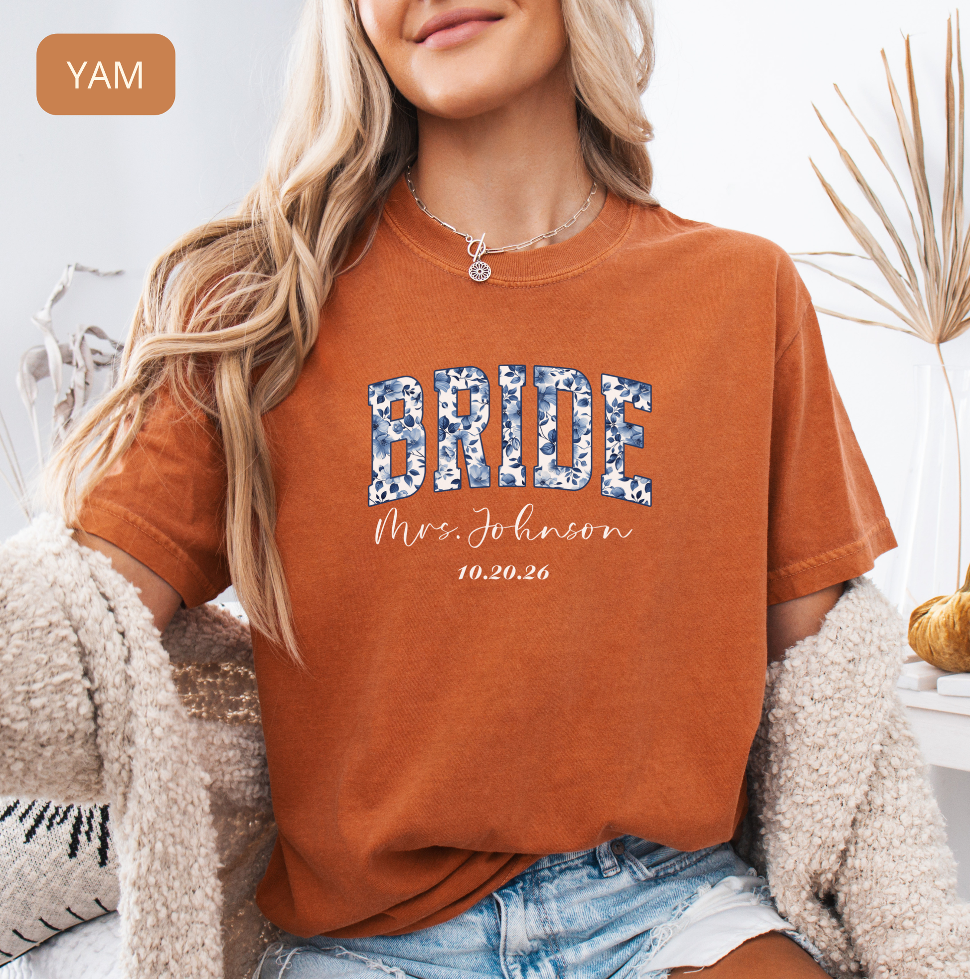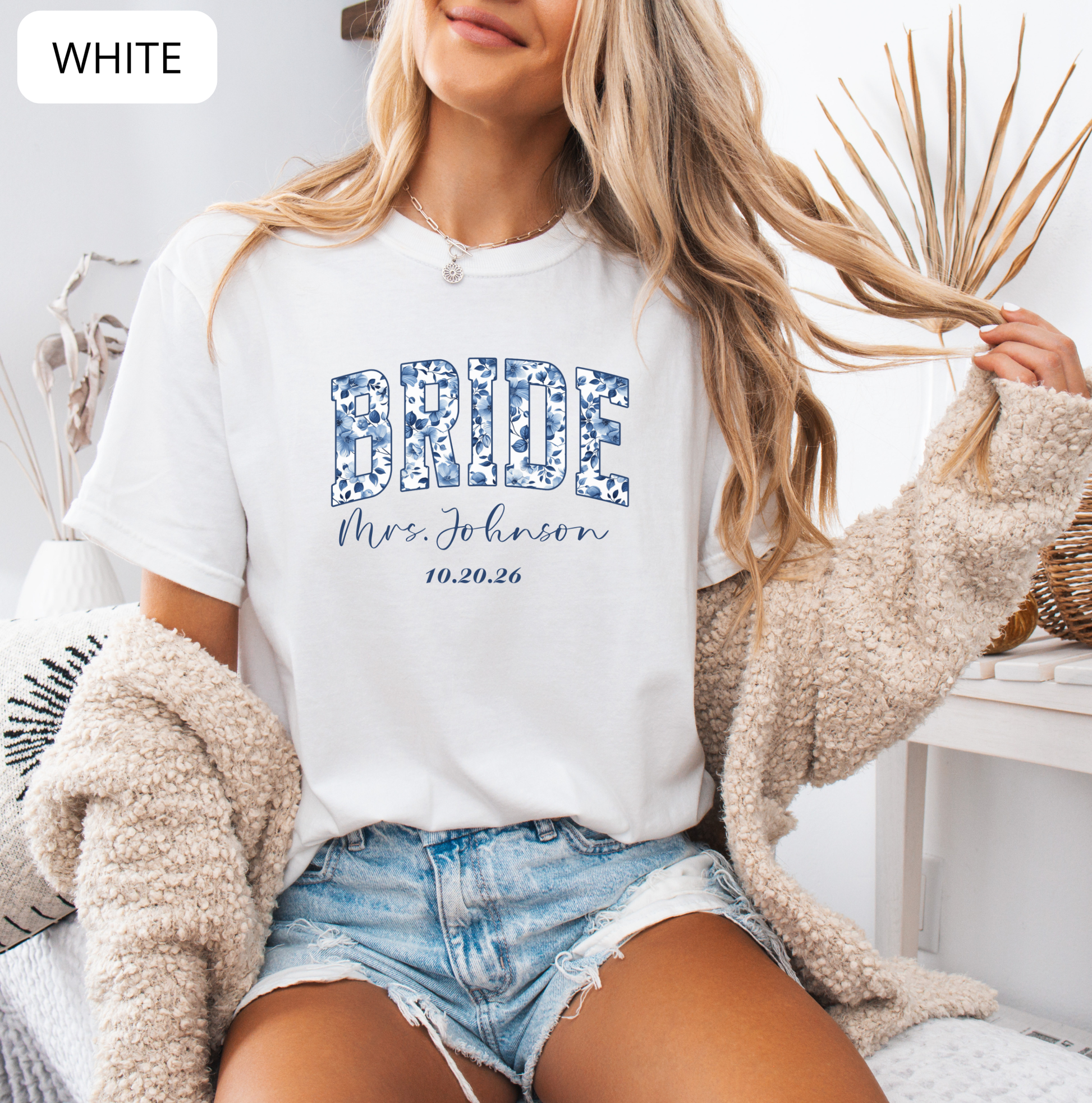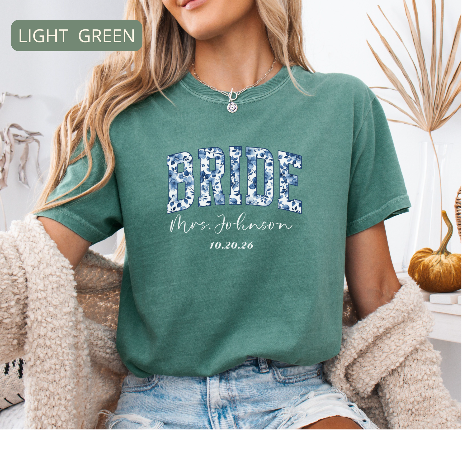 This personalized Comfort Colors bride shirt features a soft vintage feel and a delicate blue floral design that makes it perfect for wedding events, bridal showers and getting-ready photos. Cozy, flattering and meaningful — it’s a keepsake you’ll love wearing long after the big day.