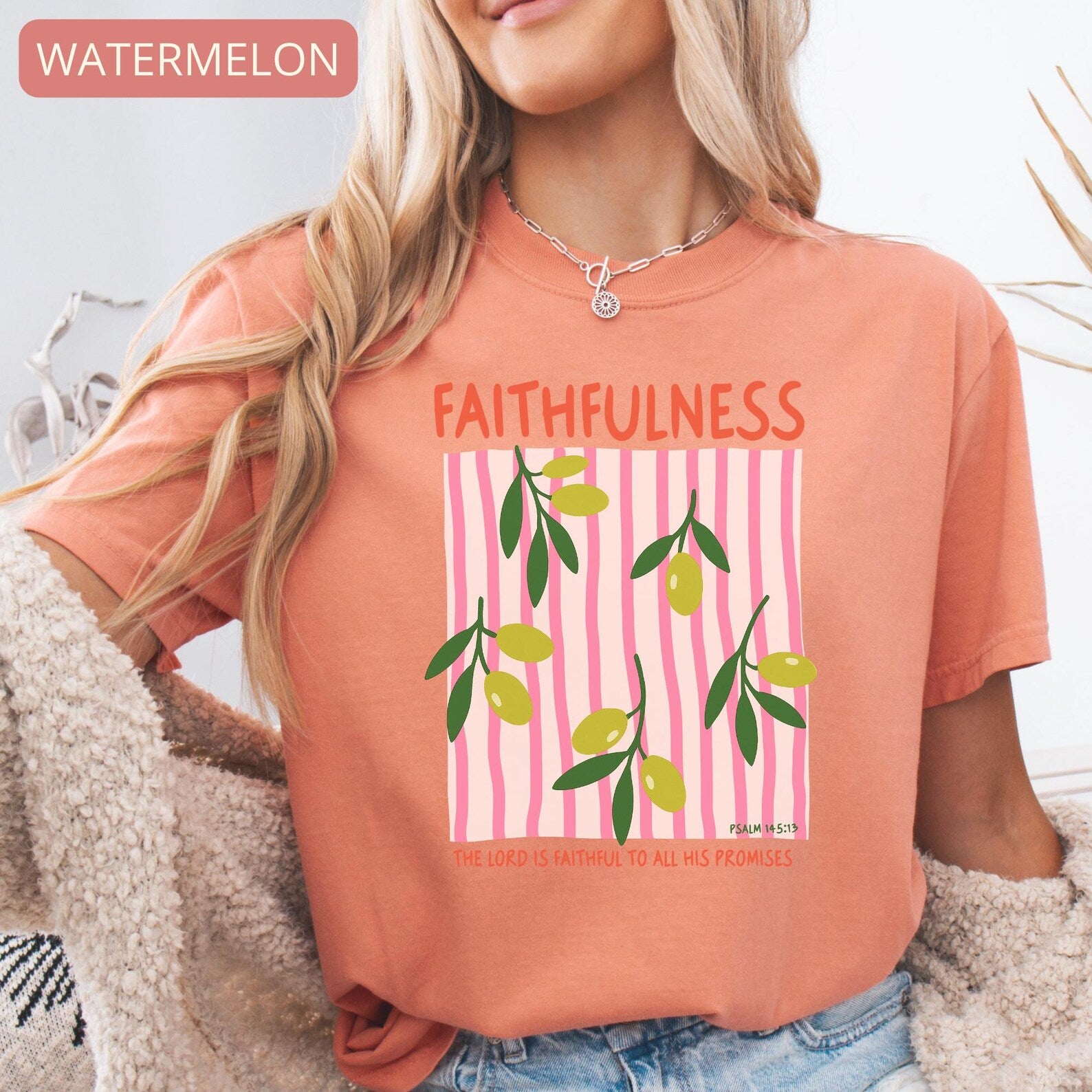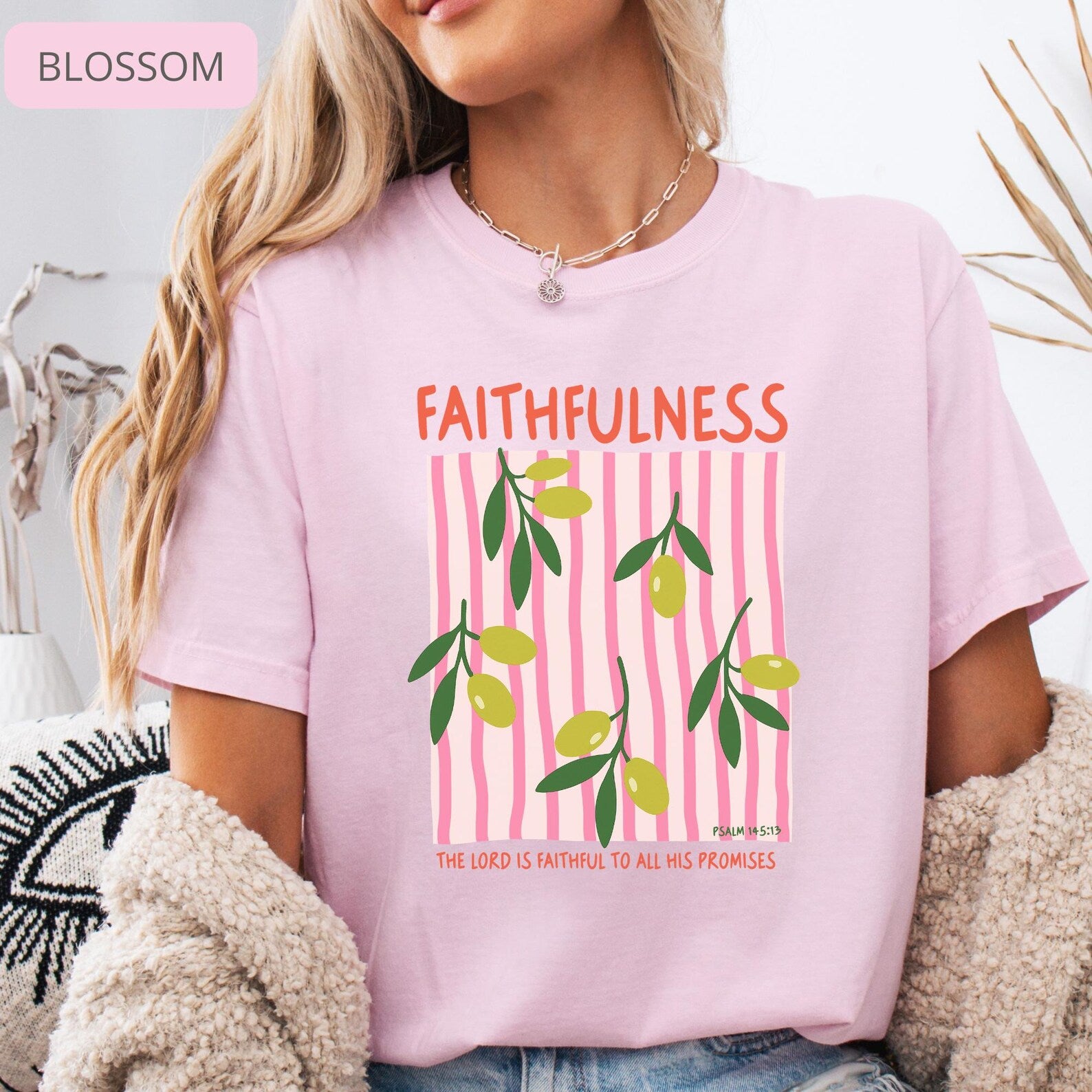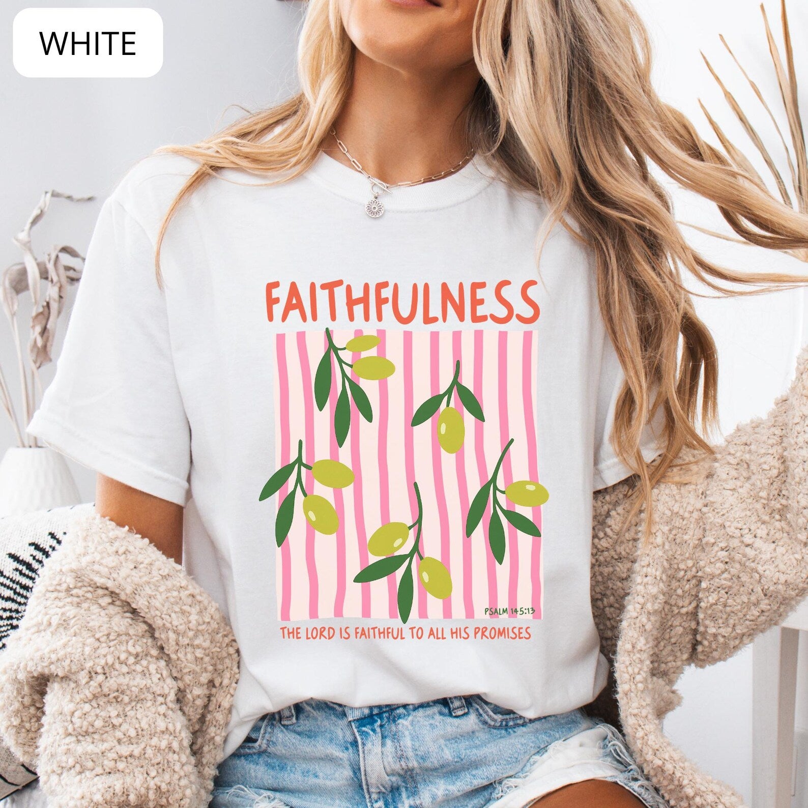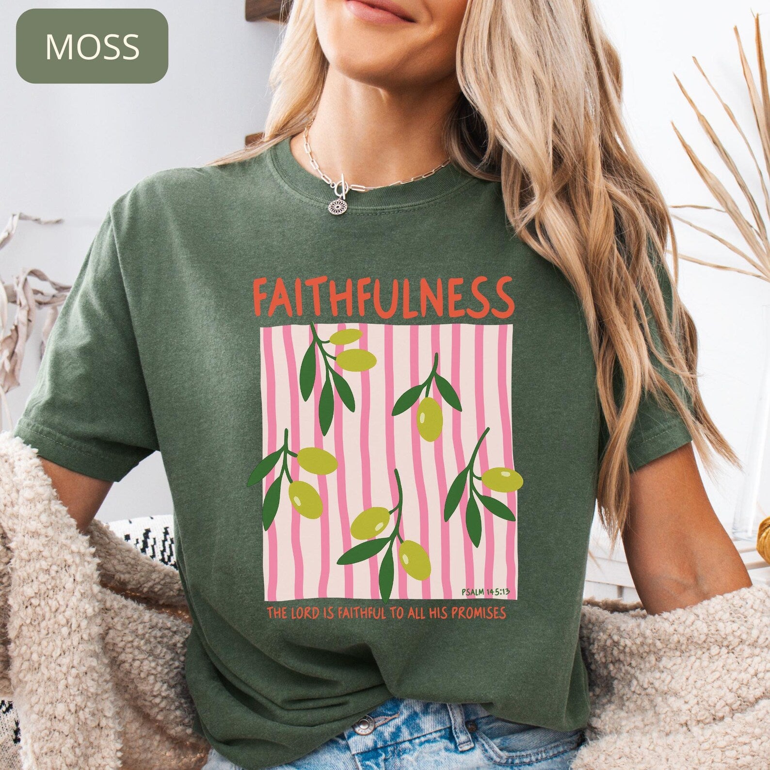 This soft and comfortable tee features a delicate olive branch illustration with a modern striped design, making it a meaningful and stylish piece for everyday wear. Perfect for church, Bible study, casual outfits, or as a thoughtful Christian gift.