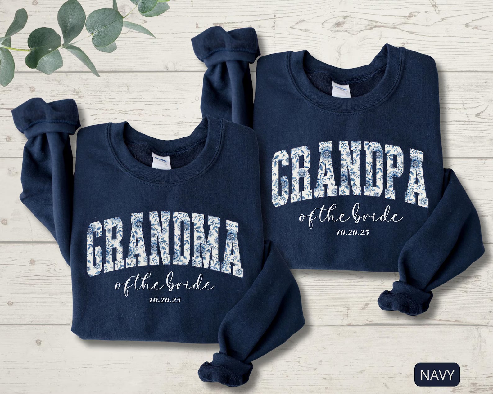 This personalized navy crewneck sweatshirt features a classic varsity “GRANDMA” design filled with delicate blue floral toile pattern, finished with elegant script text and your custom wedding date.