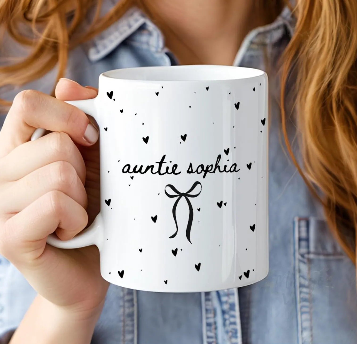 This personalized “Auntie” mug features a delicate bow and scattered heart design, creating a sweet and cozy aesthetic perfect for everyday moments.