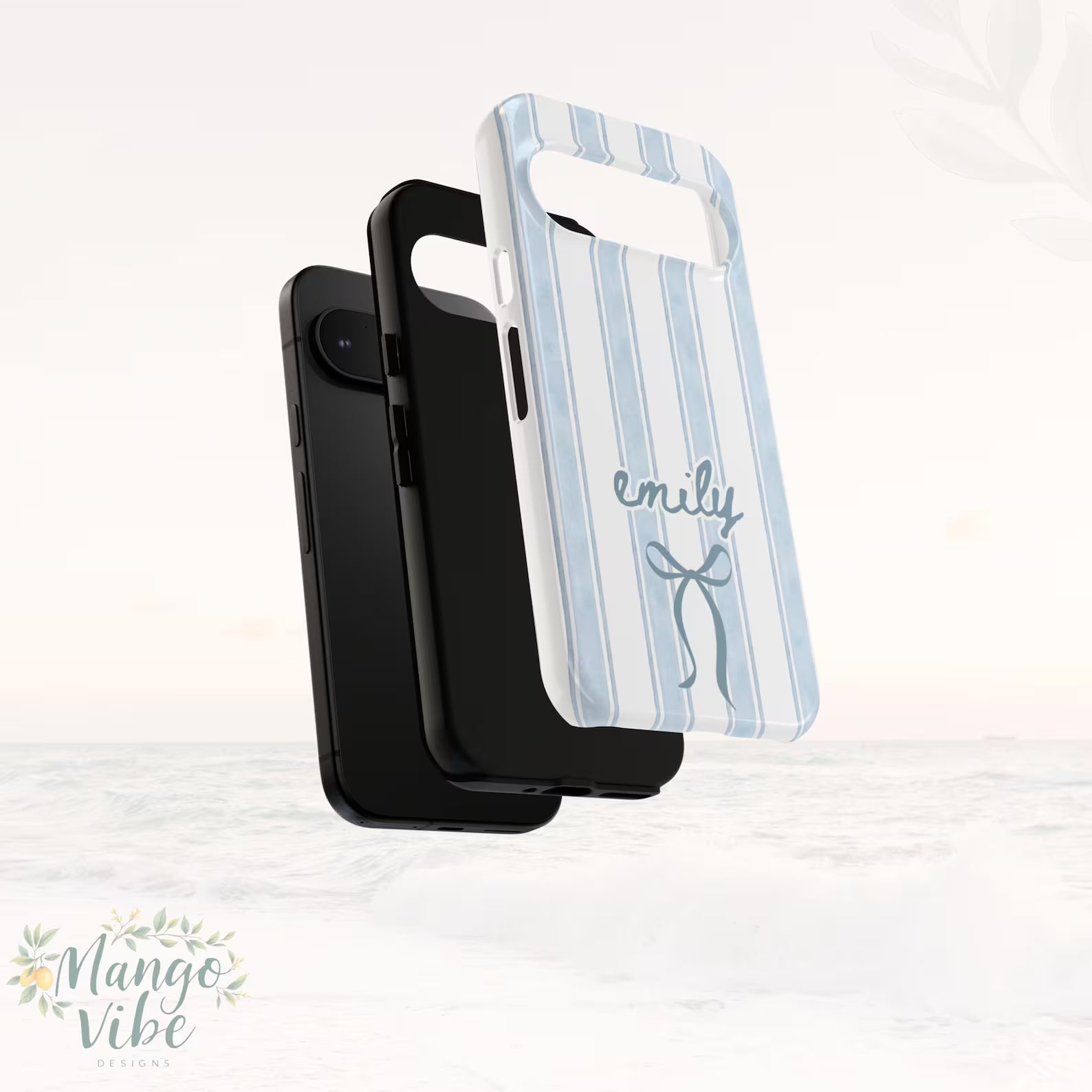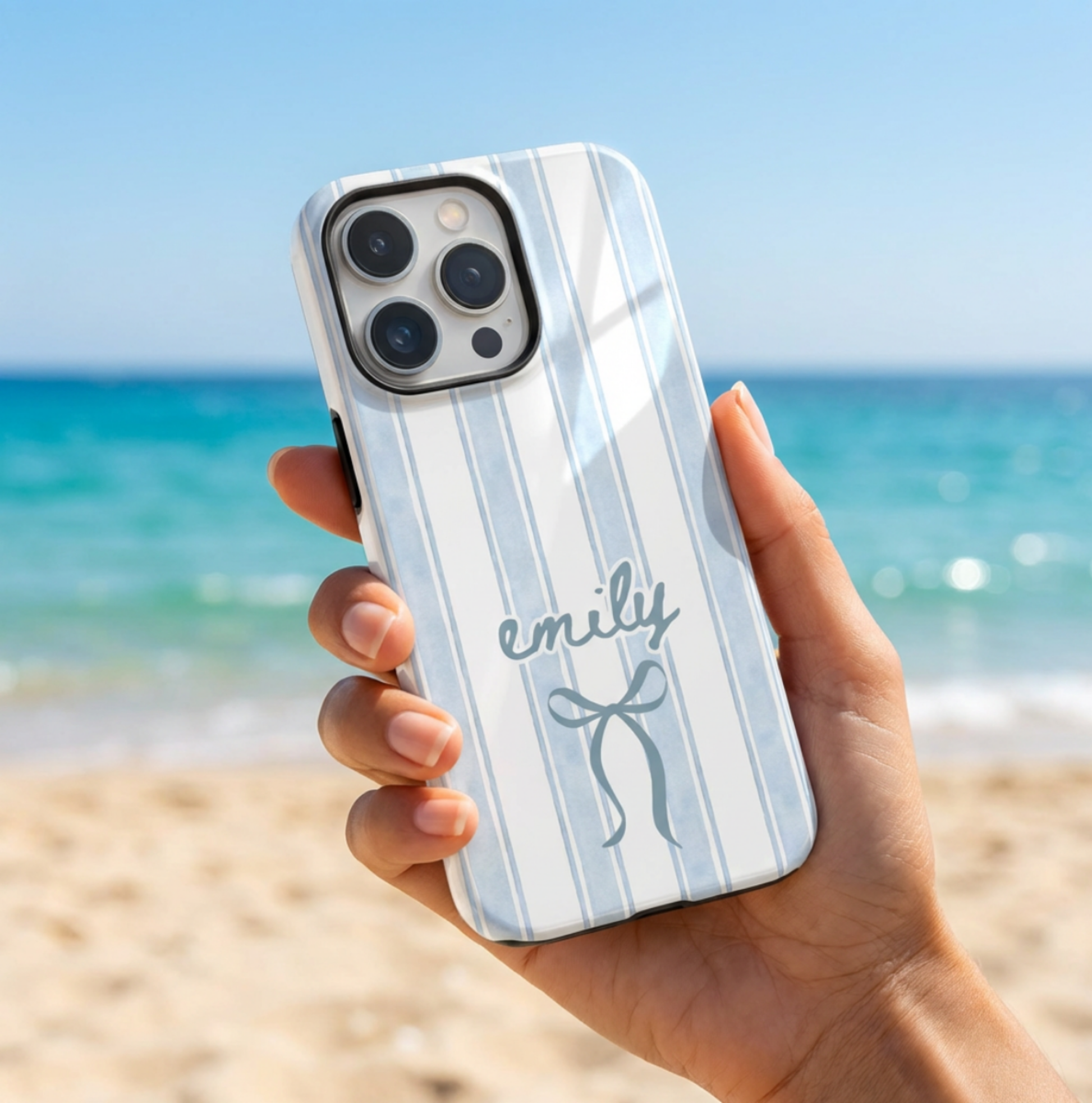 Add a soft and stylish touch to your phone with this beautiful personalized blue stripe phone case featuring a delicate bow and custom name design.