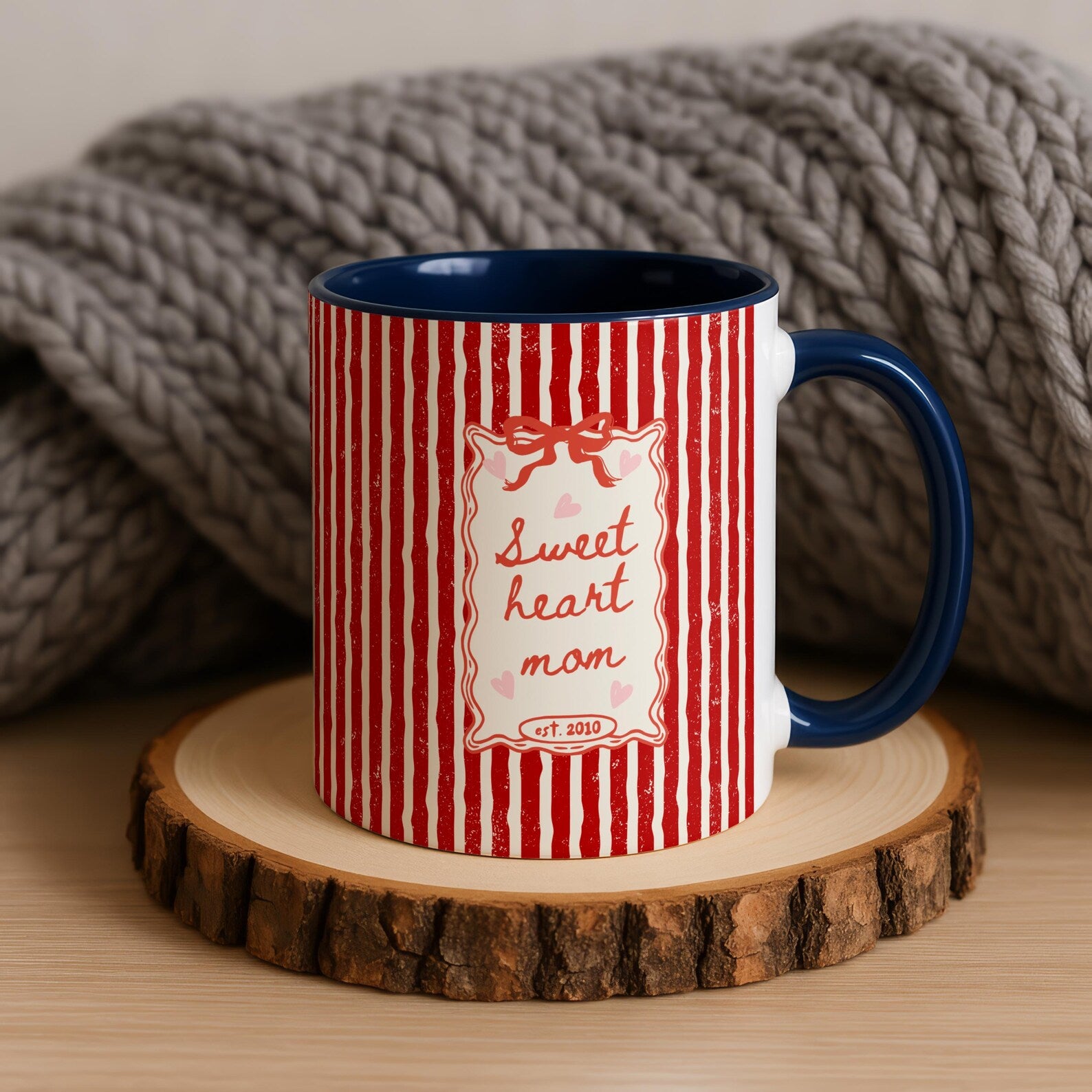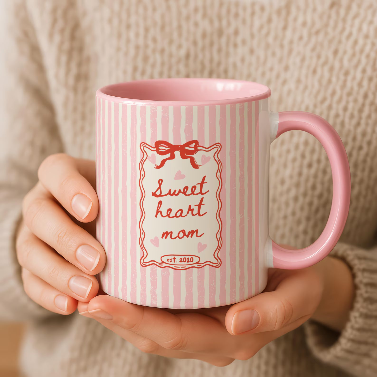 Celebrate the love and warmth of motherhood with this adorable Sweetheart Mom mug. Featuring soft pink stripes, delicate hearts, and a charming bow design, this mug brings a sweet vintage touch to your everyday coffee or tea routine.
