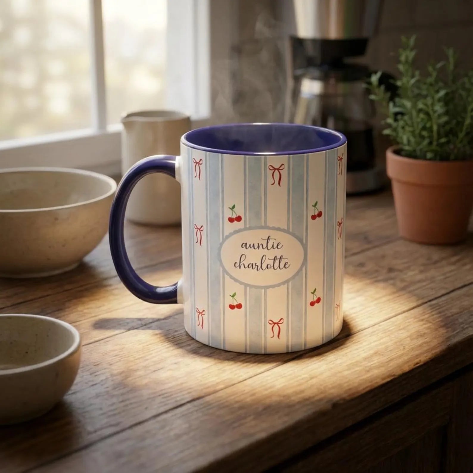 Personalized Auntie Mug with Name – Cherry Bow Coffee Cup, Pregnancy Reveal Gift for New Aunt